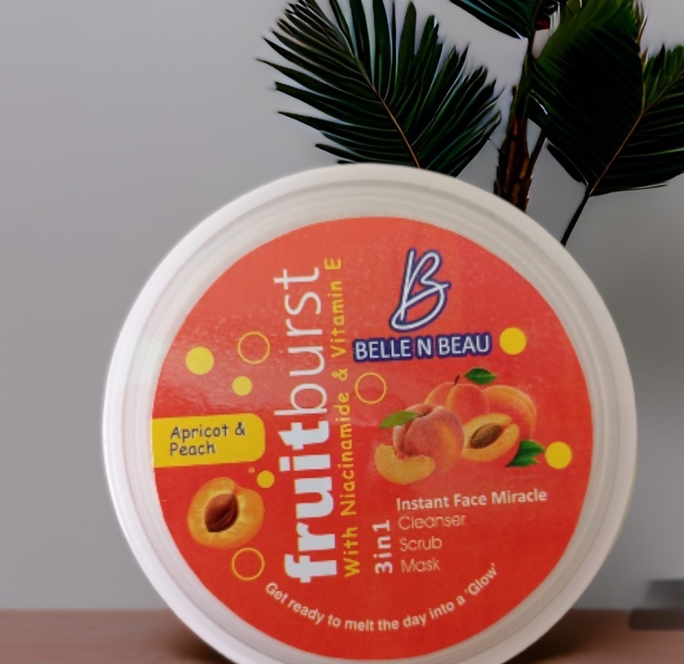 Fruit Burst Apricot & Peach 3-in-1 Face Miracle Polish is specially formulated to cleanse, exfoliate, and nourish the skin. Enriched with Apricot and Peach extracts, along with Vitamin E and Niacinamide, this gentle polish helps remove dull skin cells while keeping skin soft and hydrated.